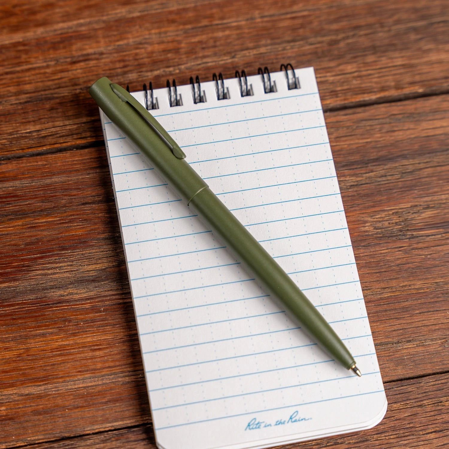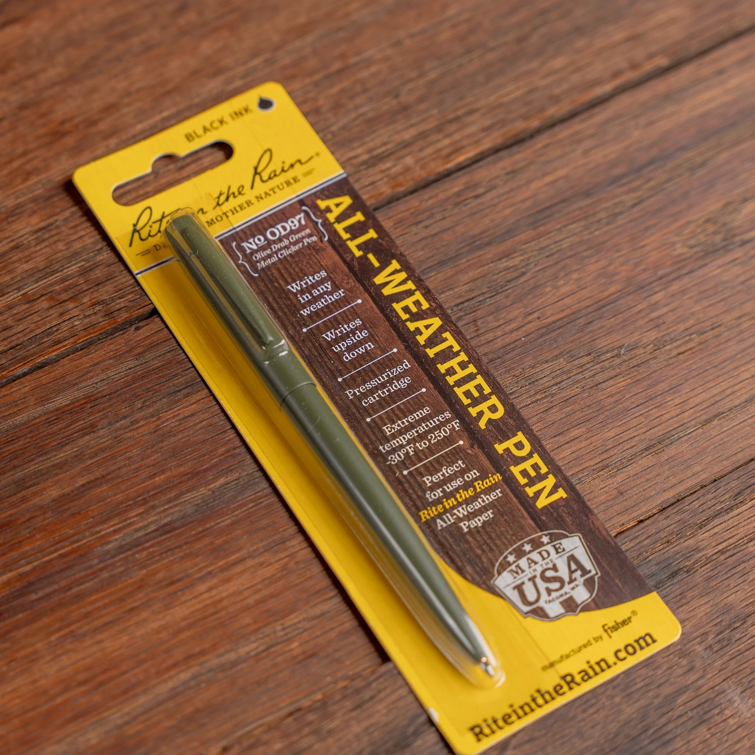 The Rite in the Rain All-Weather Metal Clicker Pen powers through weather and messes. The powder-coated brass barrel contains a pressurized ink cartridge that writes upside down and through moisture. The ink cartridge performs in temperatures from -30F to 250F and the ink won’t leak, evaporate or blow up in your pocket. A tight, durable clip clings to your shirt or pocket when the going gets rough.