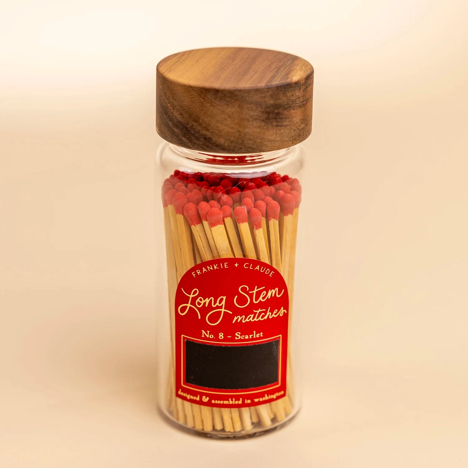 Adorn your mantle with these custom colored matches inΒ a sleek glass jar, topped with a screw-on wood acacia lid. Each jar is finished with a hand-lettered gold foil label, along with a match-striker on the label. Strike away!Β