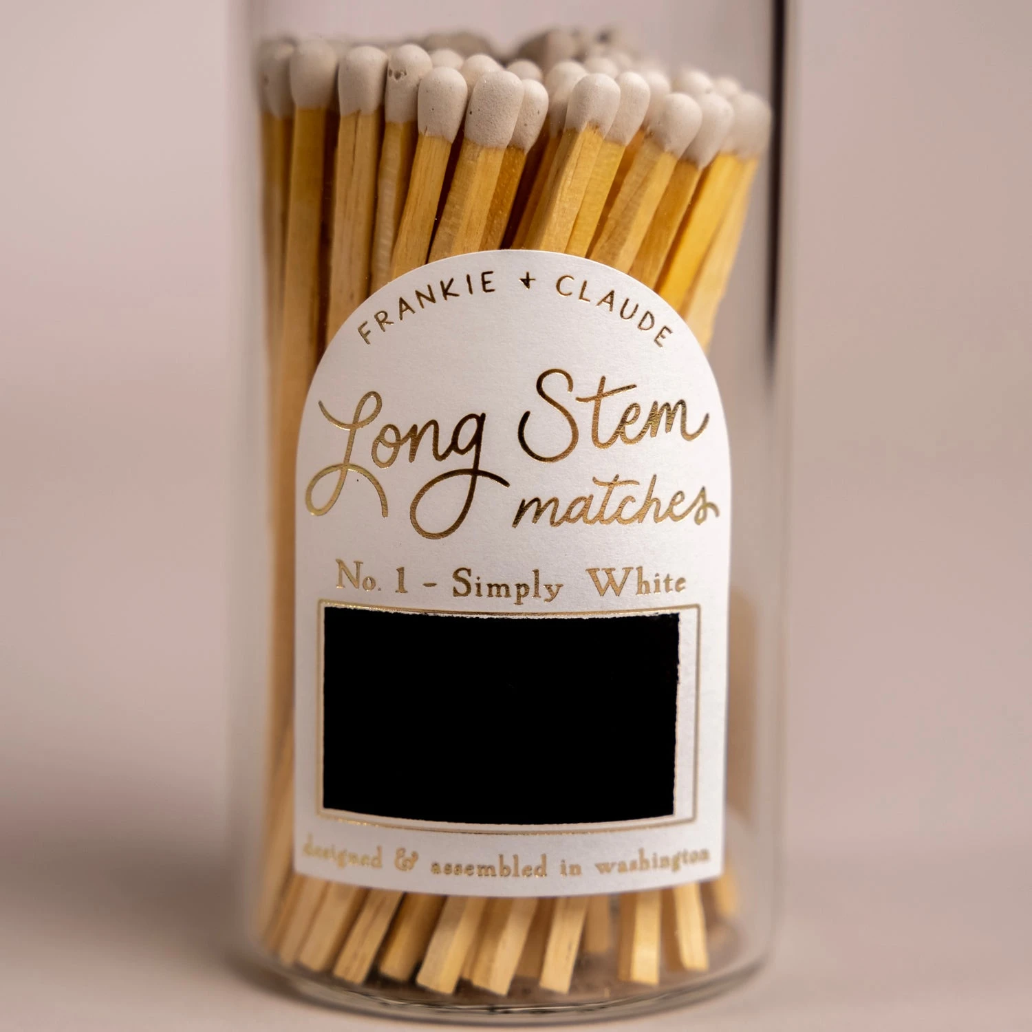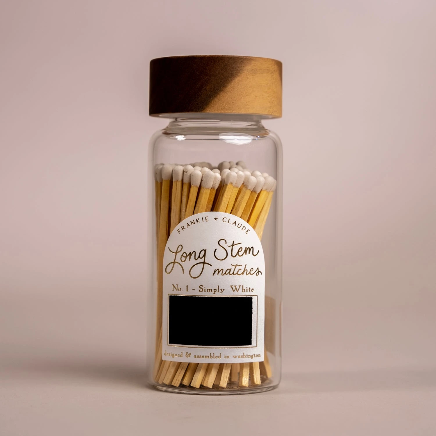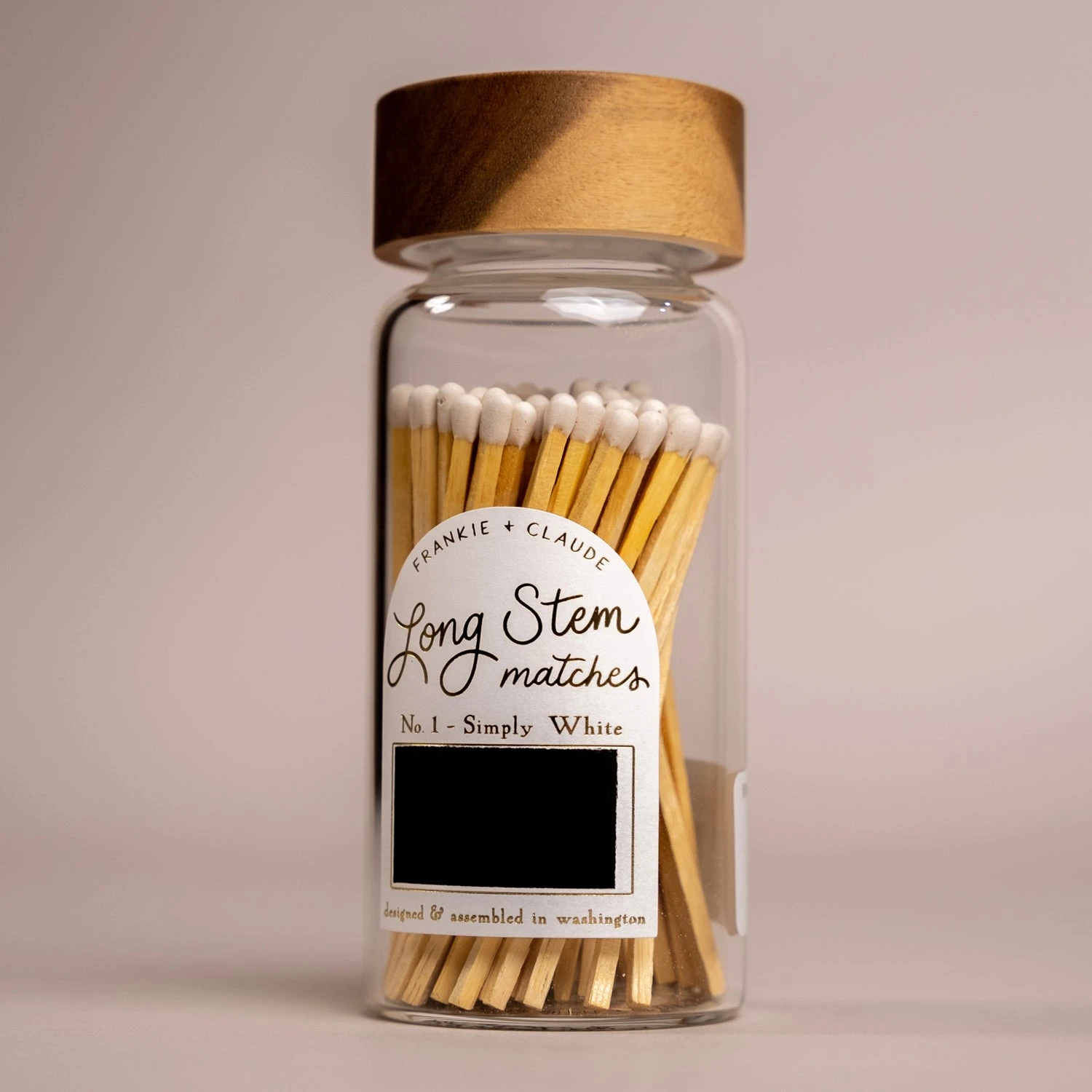 Adorn your mantle with these custom colored matches in a sleek glass jar, topped with a screw-on wood acacia lid. Each jar is finished with a hand-lettered gold foil label, along with a match-striker on the label. Strike away!